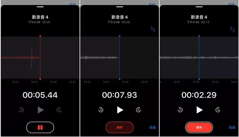 而当你将时间轴拖到音频的中间或者开头,它显示的是“替换”。这时候,你可以进行录音,覆盖掉上一次的音频。注意,音频替换属于不可逆操作。