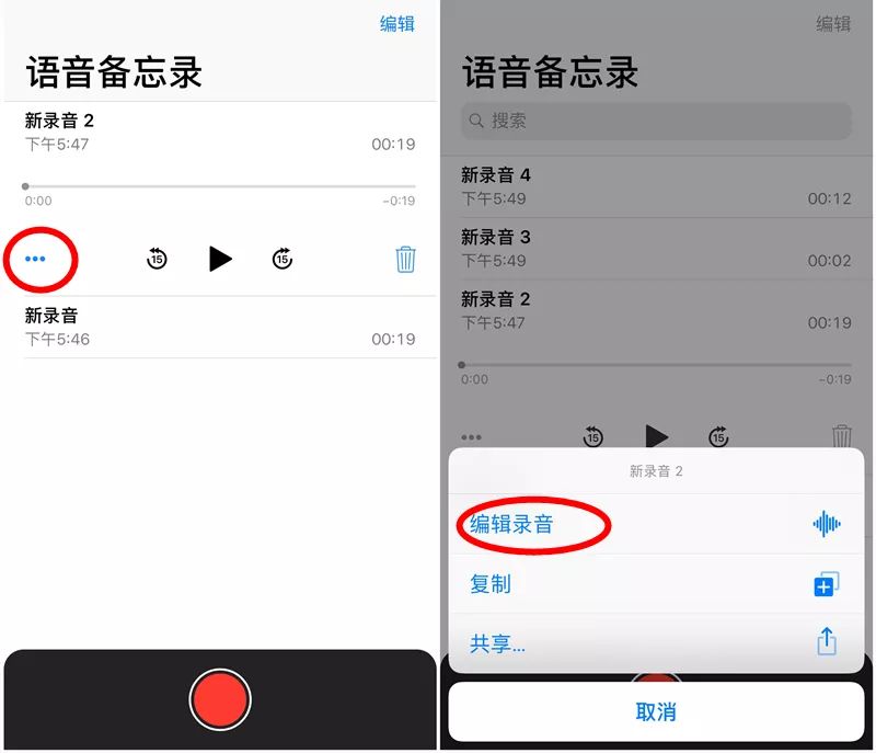 点击左边的“…”(更多选项)菜单,进入编辑录音即可。