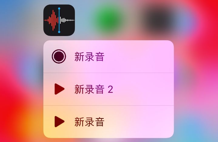 在 iOS 12 的 Home 界面,语音备忘录支持 3D Touch 快速启动,这样不需要进入应用内,就可以进行新录音,以及收听最新录音(最多三条)。