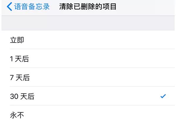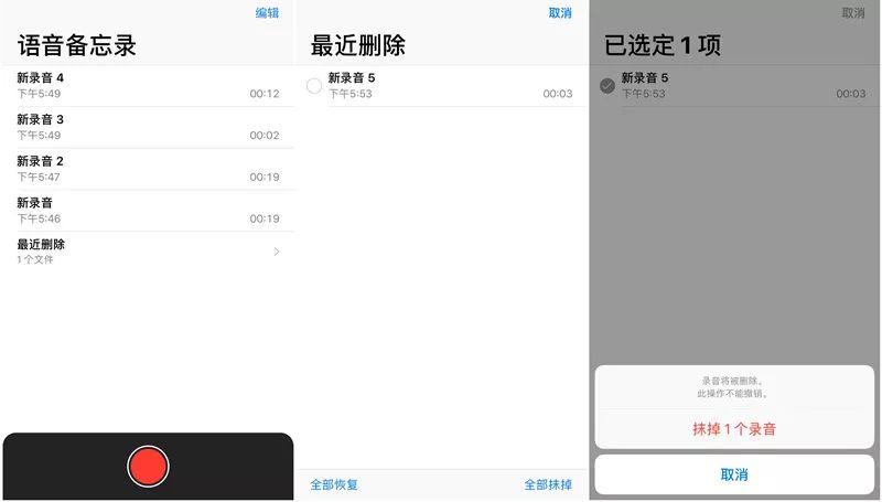 和原生相册一样,语音备忘录里被删除的整条录音,都保留在“最近删除”,点击可以选择恢复或者彻底删除。