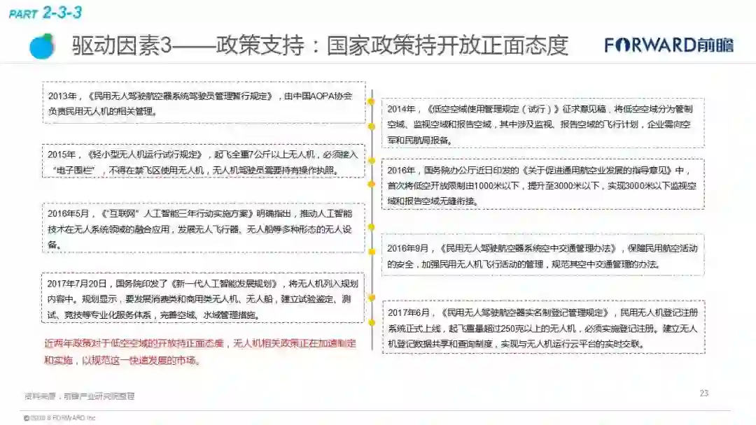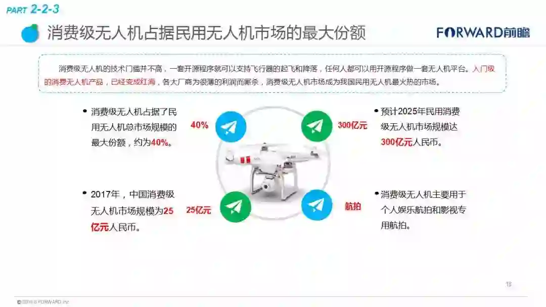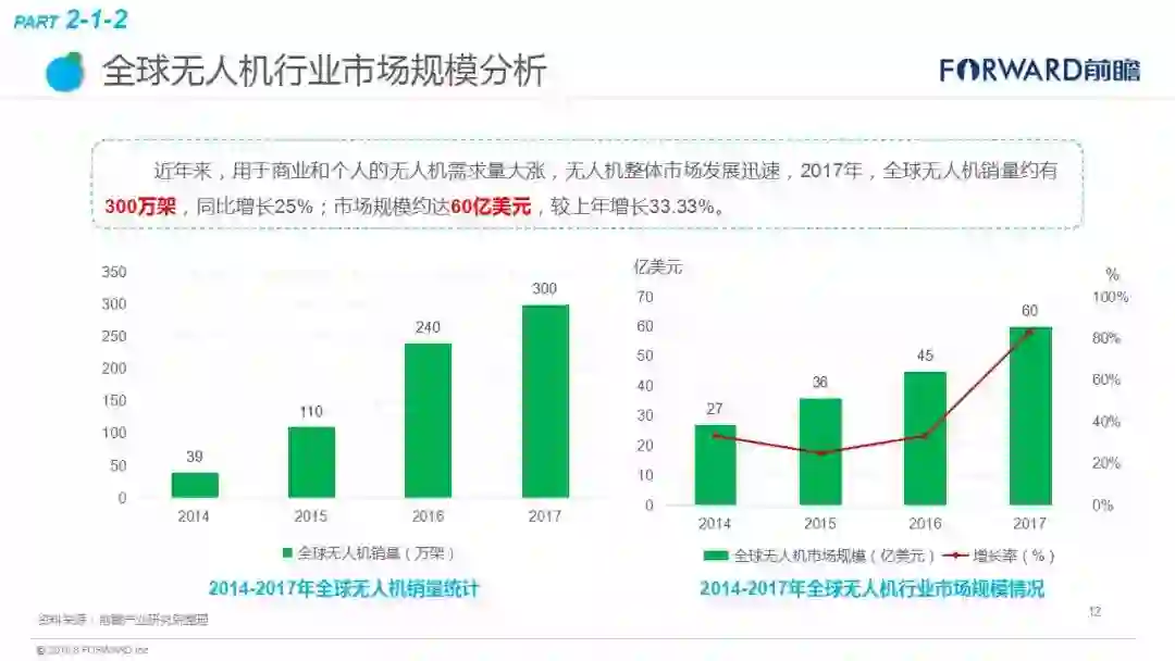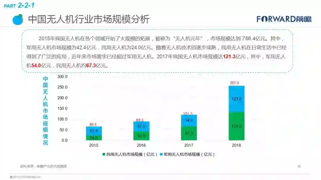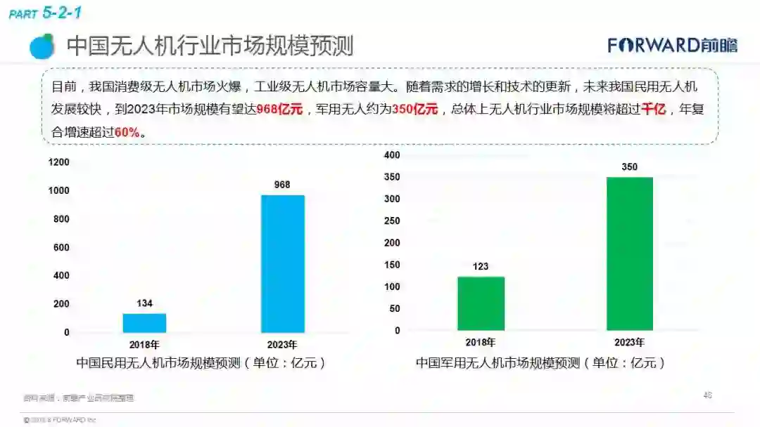 近日,中国产业咨询领导者(前瞻产业研究院)最新发布《2018年无人机行业现状与发展趋势报告》。报告显示,2015年我国无人机在各个领域开始了大规模的拓展,被称为“无人机元年”,市场规模达到了66.4亿元。其中,军用无人机市场规模为42.4亿元,民用无人机为24.0亿元。随着需求的增长和技术的更新,未来我国民用无人机发展较快,到2023年市场规模有望达968亿元,军用无人约为350亿元,总体上无人机行业市场规模将超过千亿,年复合增速超过60%,未来市场容量十分可观。