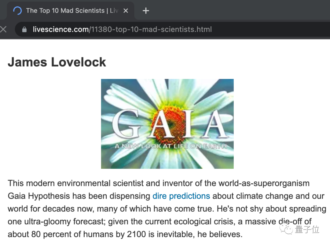 他认为地球是“活”的,把地球比作一个能自我调节的有机体“盖亚”。而由于人类对环境的破坏,这个有机体正在消灭人类。