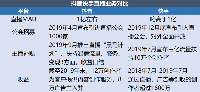 他们从2018年2月起就对外开启直播动作,快手当时全面开放了直播权限,抖音则与公会合作,招募首批主播。发展到现在,抖音、快手两家已经聚集了1亿多直播用户,不少主播也在这个平台赚到了钱。