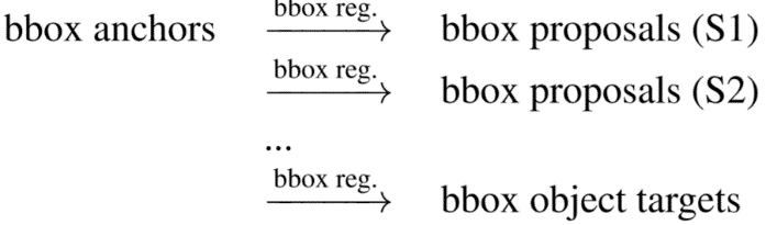 具体到在物体检测中的应用,举目前表现最好的多阶段物体检测算法为例,基于 bounding box 的物体表示出现在多个阶段,从初始阶段的锚点(anchors),到中间的候选框(proposals),再到最终的定位框,都是基于 bounding box,可以说无处不在: