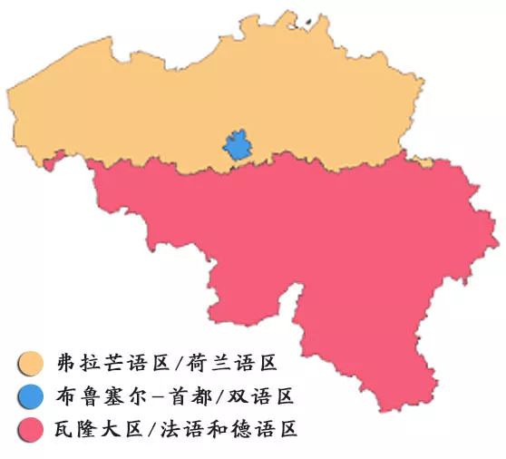 比利时全国可以被大致分为四个地区,通行三种不同的语言:北部靠近荷兰的弗拉芒地区,官方语言是弗拉芒语(可认作是荷兰语的一种方言);南部挨着法国的瓦隆地区,通用瓦隆语(与法语差别极小);还有一小块从德国获得的领土,民众说德语。