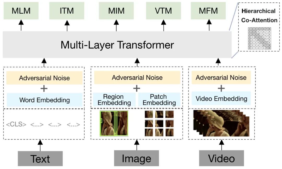 其次在Transformer层级中增加了层次化注意力交互,通过采用全局+局部注意力的方式,在不损失重要信息交互学习下,节省计算开销,提升训练效率。最后就是每种数据都增加了对抗噪声(Adversarial Noise),进行大规模对抗训练,这主要针对大模型在下游任务容易出现过拟合现象,因此在预训练和微调两阶段都增加了对抗噪声,从而提升模型的稳健性。