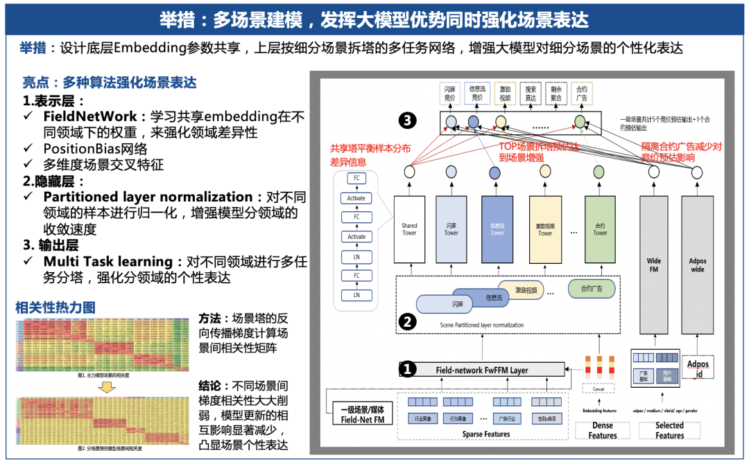 场景化说的是,对于腾讯上万的广告位,场景差异特别大。小模型只能引入场景特征,或者分场景建模,这样效果既达不到最好,维护起来也困难重重。而广告大模型,通过构建场景化模型,集成了多个算法特性组合,从而解决多场景联合建模问题。