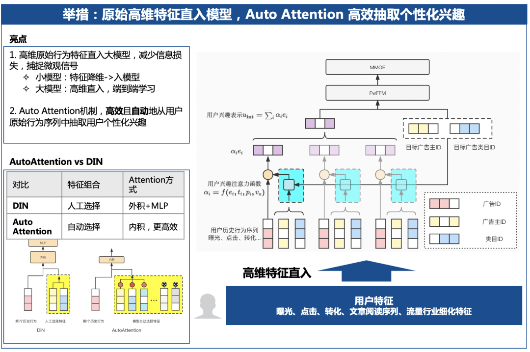 来到大模型时代,腾讯广告团队直接把用户曝光、点击、转化、文章阅读等行为高维特征植入模型,减少了信息损失。但是研发团队也发现,简单增加原始行为序列特征并不能使模型完美学习,为此进一步提出了AutoAttention,即通过注意力机制,自动且高效地抽取用户行为序列中重要的部分,增加模型表达能力。