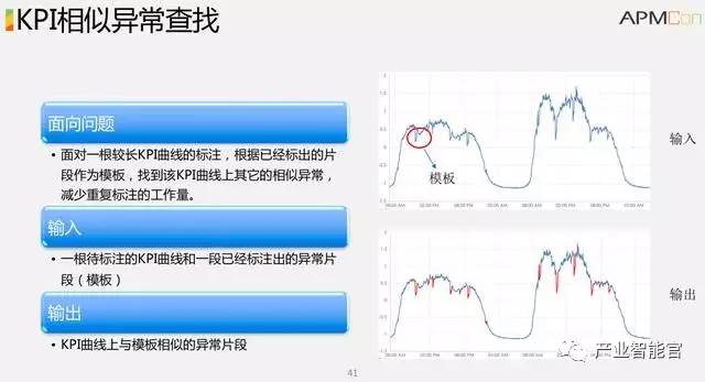 KPI相似异常查找是在KPI内找异常,运维人员标注异常,然后算法以标注的异常为模块,在曲线上找出类似的其他的异常,这样就能减少标注开销,例如图中的红色部分即为标注,输出为其它类似的异常。常用基本算法包括DTW,MK最佳配对等。