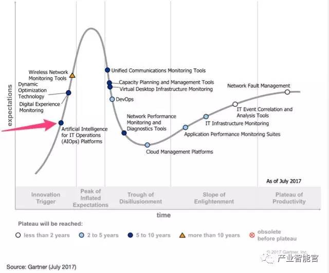 根据Gartner Report,智能运维相关的技术产业处于上升期。2016年,AIOps的部署率低于5%,Gartner预计2019年AIOps的全球部署率可以达到25%。所以,AIOps的前景一片光明。