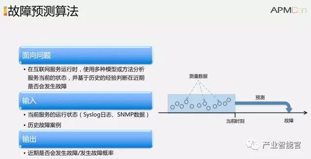 我介绍的第二个基础模块算法,是我们最近跟百度系统部合作的一个案例——交换机故障预测。在交换机故障之前,我们可以从交换机日志中提取一些预示故障的信号。如果找到这些信号,我们就可以提前两小时预测出交换机故障。故障预测的应用场景还包括硬盘故障预测、服务器故障预测等,使用到的算法包括隐式马尔科夫模型、支持向量机,随机森林等。