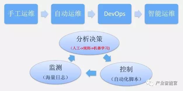 我们大家都知道,在运维发展的过程中,最早出现的是手工运维;在大量的自动化脚本产生后,就有了自动化的运维;后来又出现了DevOps和智能运维。在运维的过程中,涉及到的步骤可以概括为:产生海量的监测日志,进行分析决策,并通过自动化的脚本进行控制。运维的发展过程,主要是分析决策步骤发生了变化:起初,由人工决策分析;后来,在采集数据的基础上,使用自动化的脚本进行决策分析;最后,用机器学习方法做决策分析。