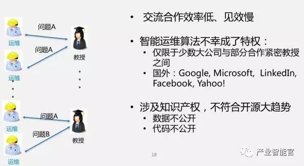 第三,虽然工业界熟悉运维行业和场景,熟悉生产实践中的挑战,也有数据。但是,工业界并不熟悉整个智能运维中最重要的部分——如何把实际问题转化为算法问题(后面会讲到如何把实践 中的难题分解成多个算法并逐个解决)。同时,工业界也不太熟悉查阅科研文献,特别是跨行业的文献。因此,智能运维是一个需要三方面领域知识结合的高门槛领域。