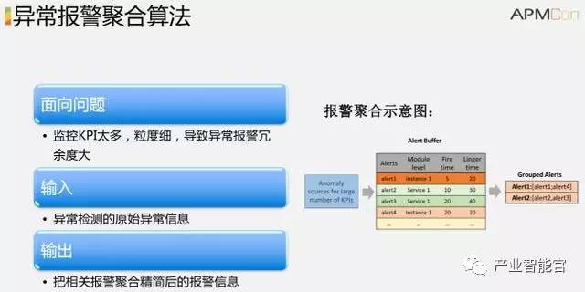 再换一个角度,现在有各种监控的报警,如果运维人员聚合不准,就无法决定下一步的操作。因为监控的KPI太多,导致异常报警冗余。我们的算法会将各种报警原始数据聚合,比如将100个异常报警聚合成5个,这样实际处理的时候就会相对容易些。具体的算法包括基于服务、机房、集群等拓扑的层次分析,还有基于挖掘的关系和基于故障传播链的报警聚合。