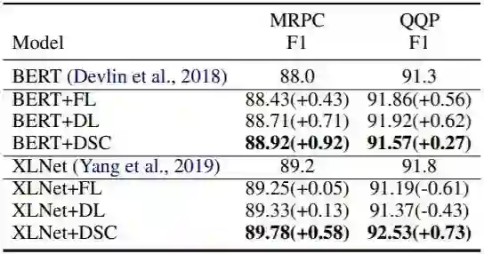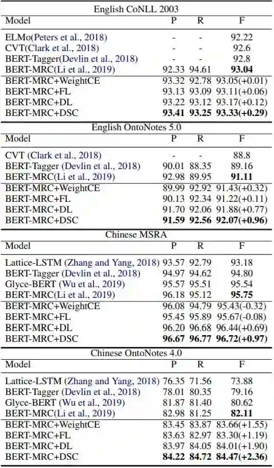 在本文中,我们提出用Dice Loss缓解大量NLP任务中的数据不平衡问题,从而能够提高基于F1评分的表现。Dice Loss 形式简单且十分有效,将Cross Entropy Loss替换为Dice Loss能够在词性标注数据集CTB5、CTB6、UD1.4,命名实体识别数据集CoNLL2003、OntoNotes5.0、MSRA、OntoNotes4.0,和问答数据集SQuAD、Quoref上接近或超过当前最佳结果。
