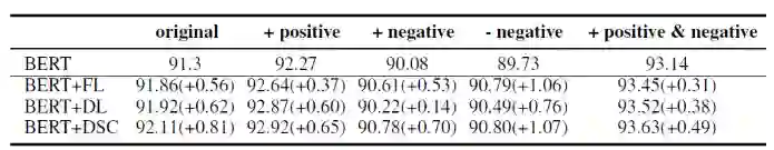 首先观察到,数据的平衡性对最终结果影响是非常大的,即使是基线模型BERT,大体上讲,数据越不平衡,最终结果就越差,当然这也受到整体数据量的影响。而对平衡的数据集(+positive,+positive&+negative)来说,DSC带来的提高略小于不平衡的数据集(original,+negative),而-negative提高最差可能与它的数据量有关。