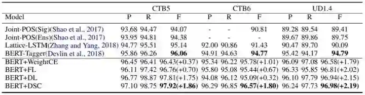 对词性标注,我们能在CTB5上达到97.92的F1,在CTB6上达到96.57的F1,在UD1.4上达到96.98,在WSJ上达到99.38,在Tweets上达到92.58,显著超越基线模型。