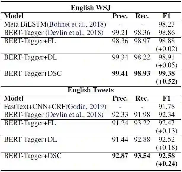与词性标注一样,DSC能够保持效果一致的提高。