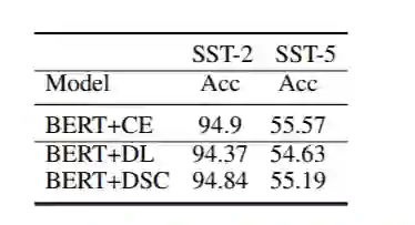 通过上述实验我们知道,Dice Loss有助于提高F1值的表现,那么对以准确率为指标的任务又如何呢?我们在SST2和SST5上实验,下表是实验结果: