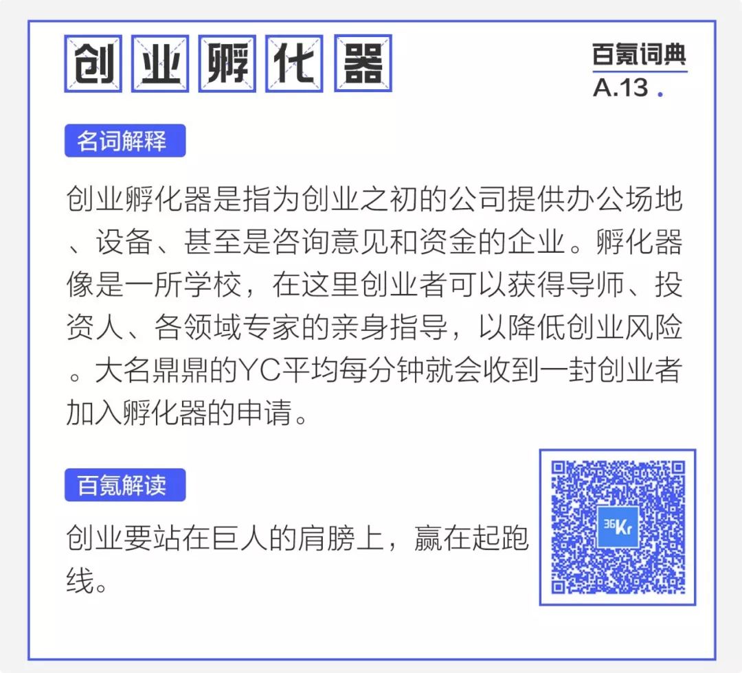 36氪「百氪词典」正式上线,用易懂的方式解读常用的互联网专业术语,丰富你的知识储备。今日解释词为「创业孵化器」,上期词语为「独角兽」。识别图中二维码,获取往期百氪词语,收获更多知识。