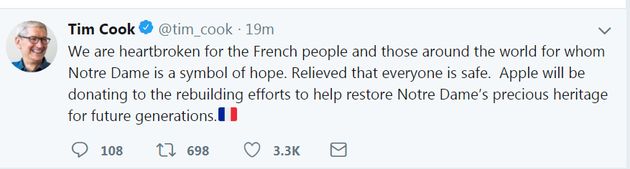 据外媒报道,苹果CEO蒂姆·库克在Twitter上发布推文称,苹果将通过捐款来帮助重建巴黎圣母院。库克表示,“我们为法国人民和全世界人民感到心碎。对于我们所有人来说,巴黎圣母院代表了希望。令人感到欣慰的是,每个人都很安全。苹果将捐款支持重建计划,帮助恢复巴黎圣母院的珍贵的文化遗产,并留给后人瞻仰。”(腾讯科技)