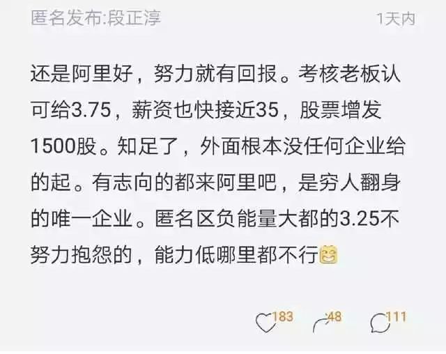 下面又是另外一名阿里员工的炫耀帖:还是阿里好,努力就有回报,考核老板认可给 3.75,薪资也将近 3 万 5,知足了,股票增发 1500 股,外面根本没有任何公司给的起,有志向的都来阿里工作吧,一穷二白翻身的最佳选择。