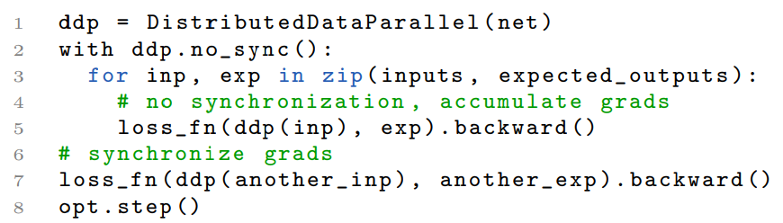 此外,DDP 无法分辨应用程序是计划在反向传播之后立即调用 optimizer.step()还是通过多次迭代累加梯度。因此,研究者需要为这个用例再引入一个接口(即 no sync)。以下是样例代码片段: