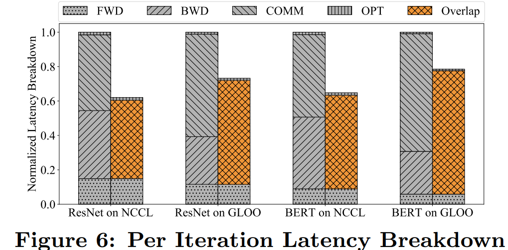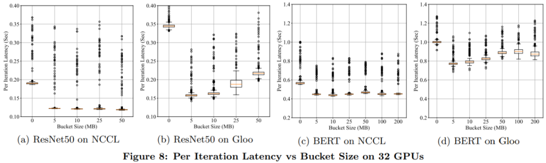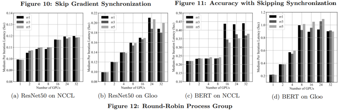 为了验证通信重叠计算的有效性,下图 6 展示了 ResNet50 和 BERT 模型分别使用 NCCL 和 Gloo 反向传递时的延迟故障。所有实现都用到了 4 台服务器上的 32 个 GPU。