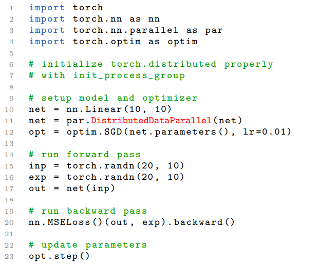 根据以上需求,研究者用 nn.Module 实现了分布式数据并行。nn.Module 采用本地模型作为构造函数的参数,并在反向传播中透明地同步梯度。下面的代码是使用 DDP 模型的示例: