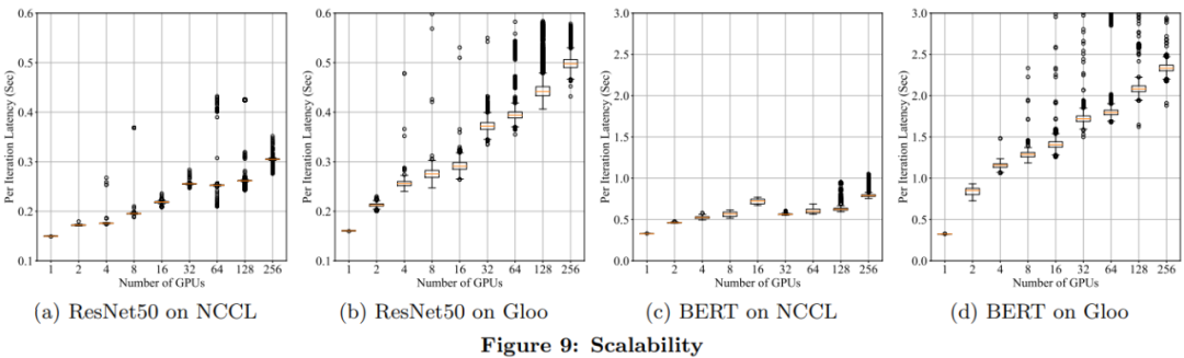 为了理解 DDP 的可扩展性,研究者用多达 256 个 GPU 上的 NCCL 和 Gloo 后端来度量 ResNet50 和 BERT 每次迭代的训练延迟。结果如下图 9 所示。