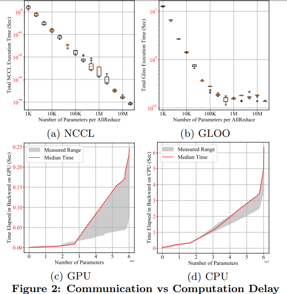 下图 2(a)和 (b) 给出的定量视图展示了在每个 AllReduce 中参数数目不同的情况下,AllReduce 60M torch 的 float32 参数的完整执行时间: