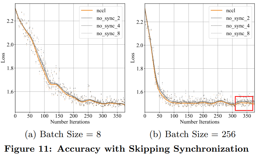 除了每次迭代延迟,测量收敛速度以验证加速度是否会因收敛放缓而被消除也非常关键。实验采用 MNIST 数据集来训练 ResNet。学习率设置为 0.02,批处理大小是 8。结果如下图 11(a)所示;图 11(b)是将批处理大小设为 256,学习率设为 0.06 的测量结果。