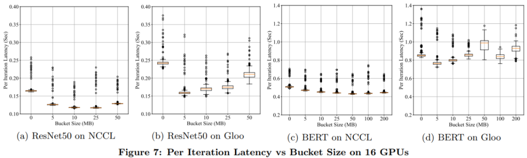 bucket 大小是一个重要的配置选项。根据经验,出于最大努力估计,bucket_cap_mb 的默认值是 25MB。研究者使用两台机器上的 16 个 GPU 比较不同 bucket 大小下每次迭代的延迟。另一个极端是在短时间内传递全部的梯度,结果如下图 7 所示。