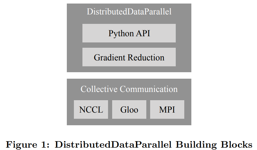 下图 1 描述了 DDP 构造块的组成,其中包含一个 Python API 前端和 C++ 梯度下降核心算法,并采用了 c10d 聚合通信库。