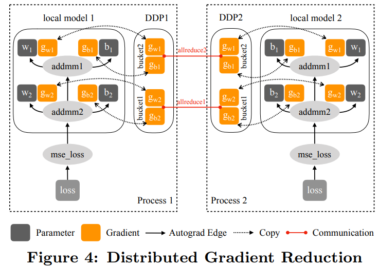下图 4 展示了 DDP 在前向传播和反向传播过程中如何与本地模型交互: