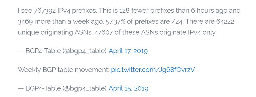 一个名为BGP4-Table的Twitter机器人程序也一直在跟踪全局BGP路由表的大小,预料会出现768k日;它估计文件的实际大小为767392,离溢出仅一步之遥。