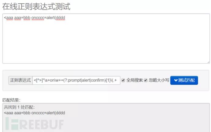 这里就要分析为什么<img src=x onerror=alert(xxxx>会wa,但onerror=alert(xxxx不会,只有补全了右括号才会的原因,我的猜测是前者触发了另一条waf规则(针对标签开头的waf规则<[^>]*\s+on\w+=(?:prompt|alert|confirm){1}\(\w+,用<..aaaa onbbbb=alert(ccc成功触发waf(注意这里用\w的原因是比较懒,经过测试数字型on1111并不会被wa,描述清结构即可=。=)