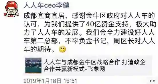 1月21日消息,据界面报道,知名二手车电商平台人人车已与成都市金牛区人民政府签订人人车运营投资总部项目合作协议。1月18日,人人车创始人李健发朋友圈表示,金牛区政府为人人车提供了40亿资金支持。