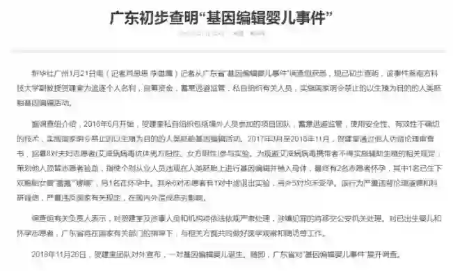 雷锋网消息,1 月 21 日,新华社报道了关于“基因编辑婴儿事件”的初步调查结果,该结果宣称,该事件是南方科技大学副教授为了追逐个人名利而进行的人类胚胎基因编辑活动;而在此过程中,贺建奎自筹资金,蓄意逃避监管,私自组织了有关人员,从而进行了这项国家明令禁止的以生殖为目的的活动。