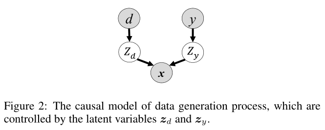 针对第一个问题,作者从数据生成过程背后的因果机制入手,如下图所示,给定由两个独立的潜在变量生成的 x,其中域潜在变量 对域信息编码,语义潜在变量 对语义信息编码,并且假设两者相互独立。作者还考虑到域信息在不同域之间可能存在很大差异,因此推断语义潜在变量在提取域不变表示中起着重要作用。