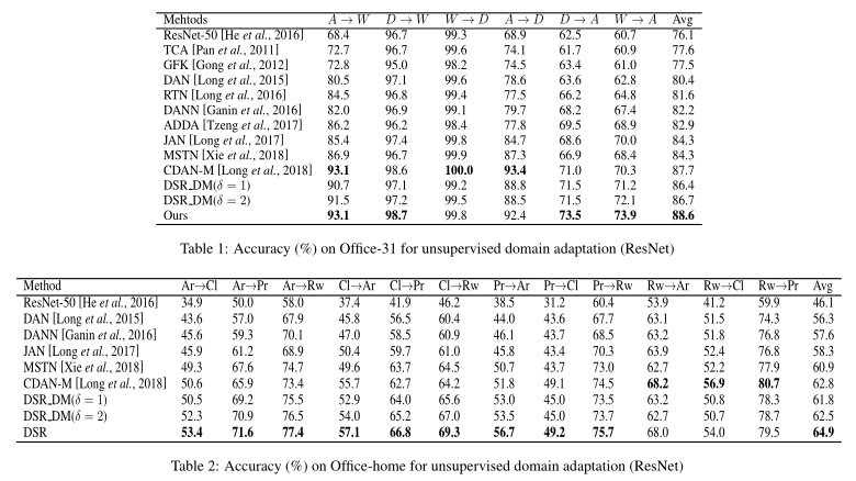 从实验结果来看,DSR 在数据集 Office-Home 的大多数迁移任务上优于其他Baseline,尤其显著提升了硬迁移任务的分类精度,但在 W→D 和 A→D 任务上的结果低于一些比较方法,这是因为域中的样本数量过少导致 DSR 模型不足以重建可解耦的语义表示。