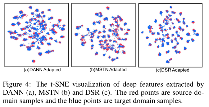 可以看到,DSR 的对齐效果更佳,而 DANN 和 MSTN 都有大量样本的对齐存在错误。