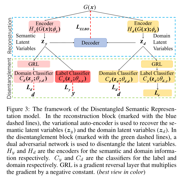 在解耦合块中,使用双对抗网络对潜在变量解耦合。图的左侧是利用了语义潜在变量 的标签对抗学习模块,融合了语义信息,并对域分类器 用梯度反转层 (GRL) 排除了所有的域信息。这是通过使用标签分类器 和域分类器 来完成的。图的右侧是域对抗学习模块,将域信息融合到 中,并从 中排除语义信息。同时将 GRL 用于标签分类器上,以便掌握来自 的所有域信息。但与语义模块不同的是,作者没有用交叉熵作为标签损失,因为目标域中的无监督学习。