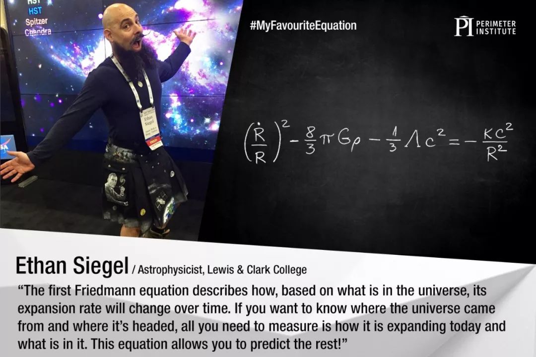 上周,在加拿大圆周理论物理研究所的一次活动中,邀请了14位科学家选出他们心中最喜爱的公式。不难想象,许多人都选了那些著名的基本方程组,包括万有引力定律、麦克斯韦方程、薛定谔方程等等。其中天体物理学家Ethan Siegel选出来的这个方程对宇宙学研究极其重要,却并不那么广为人知,它就是第一个弗里德曼方程,是在特定条件下从爱因斯坦的广义相对论中推导而得的。