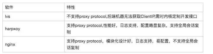 主要调研了lvs/haproxy/nginx这三种开源产品在四层负载方面功能特性,新LB方案水平扩展相对容易,选型阶段主要考察功能支持情况,情况如下: