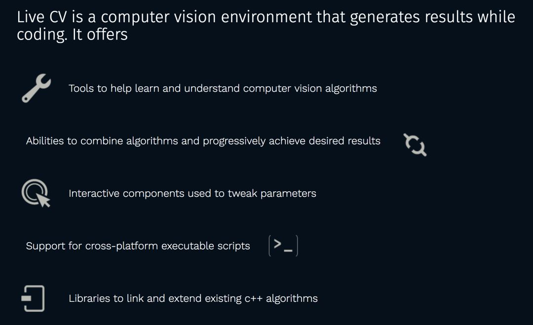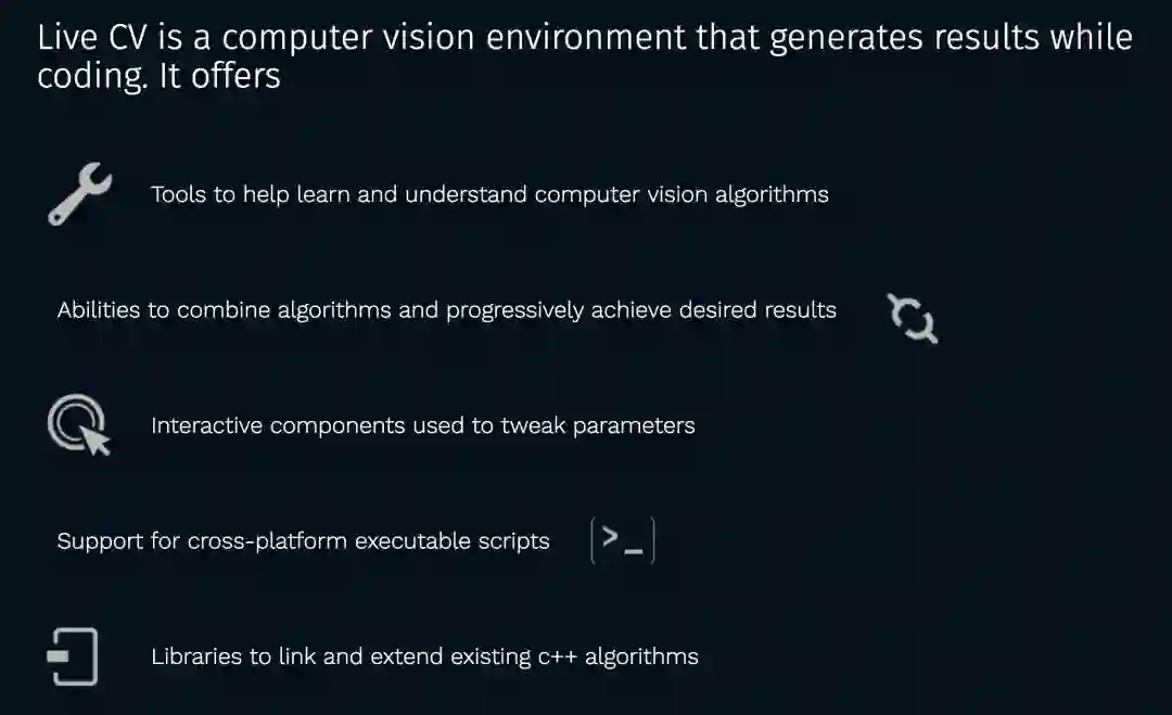 Live CV 是一个用于实现显示结果的计算机视觉算法开发环境,基于 QtQuick 开发。它可以用于交互、链接和调整算法,以便快速创建解决方案。