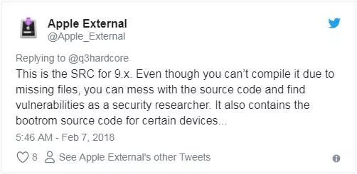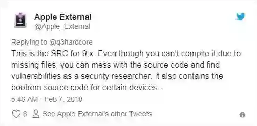 此外 GitHub 上泄露的源码缺少了部分文件,因此无法编译完成。然而 Twitter 安全专家表示,黑客和安全人员有望挖掘出 iOS 系统的漏洞,并创建越狱方案。