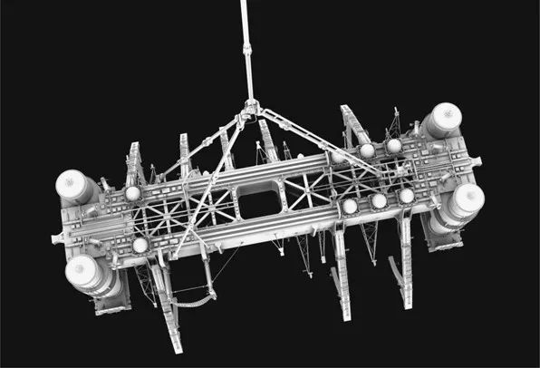 下一步就是准备起浮了。起浮分为两步:抬起和回收。抬起阶段,由CV两端的四条支撑腿同时伸展,提供上抬的力量。一旦潜艇摆脱了惯性,四条支撑腿则脱离CV,由“瘦身”之后的CV抱住潜艇回收到母船——因为是在环境恶劣的深海作业,CV本身是没有动力的,全部靠母船HGE来提供,CV的液压系统也是由母船抽取浅层海水并加压,通过连接母船和CV的“钢杆”(其实是钢管)传递下去。同时,母船也要进入“CV对接/释放”状态,把两条高耸的对接滑轨深入水面,以降低重心。