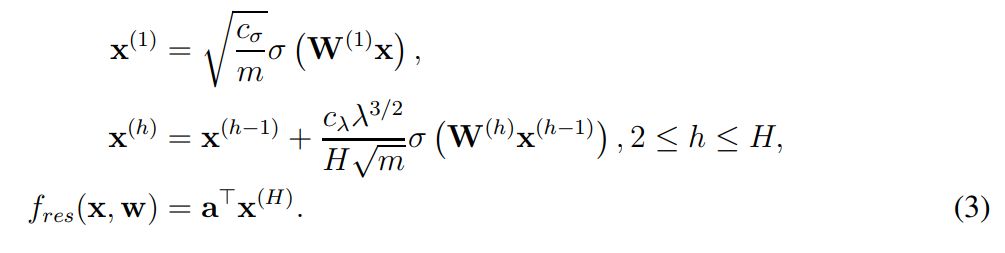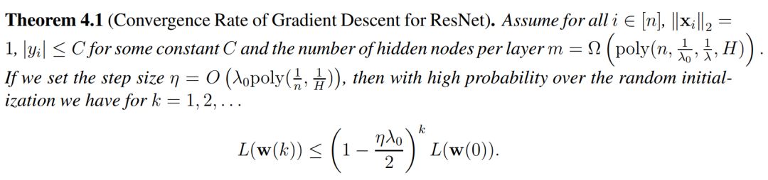 注意 λ 在这里仅依赖于 K^(0),因此它的定义与全连接网络中的不太一样。一般而言,除非两个数据点是平行的,否则λ通常都是正数。在有了这个假设以后,作者给出了他们对 ResNet 的主要定理: