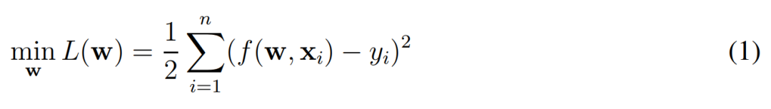 在这一章节中,作者主要会考虑使用梯度下降训练 ResNet 的收敛性,并关注到底需要多大程度的过参数化才能确保梯度下降收敛到全局最优解。当然在这之前需要明确 ResNet 的形式化定义是什么样的。在这篇论文中,作者们主要分析了不同神经网络的经验风险最小化问题,其中损失函数由一般的欧式距离定义: